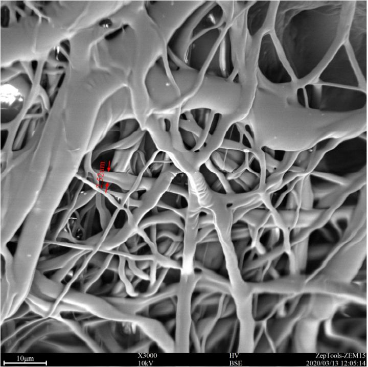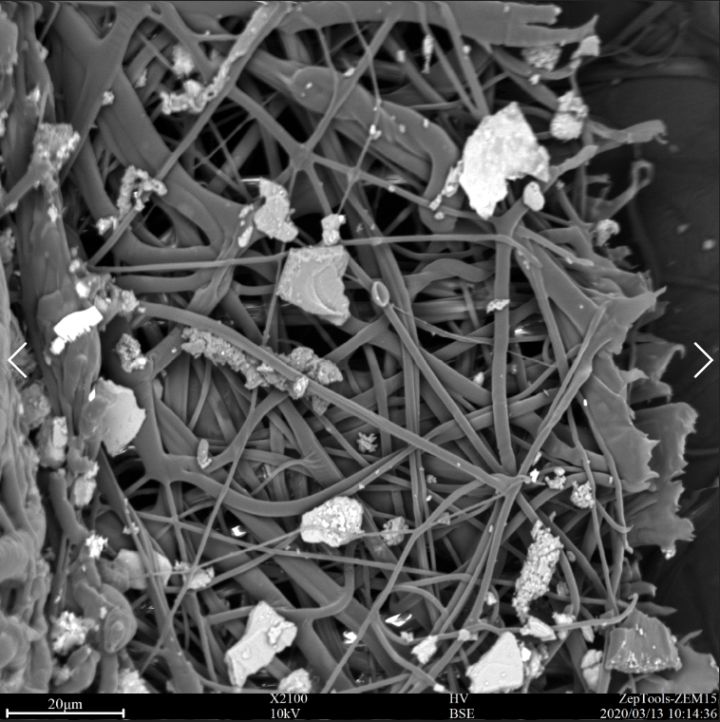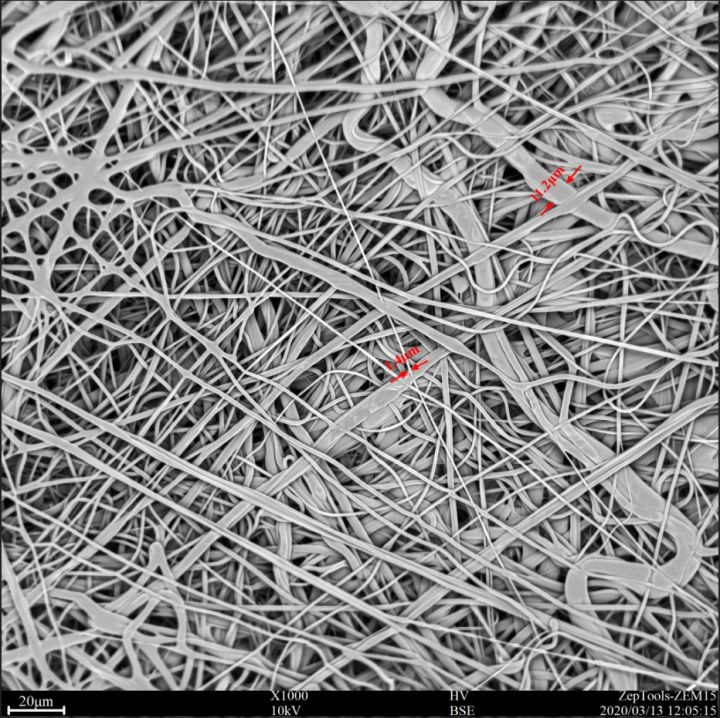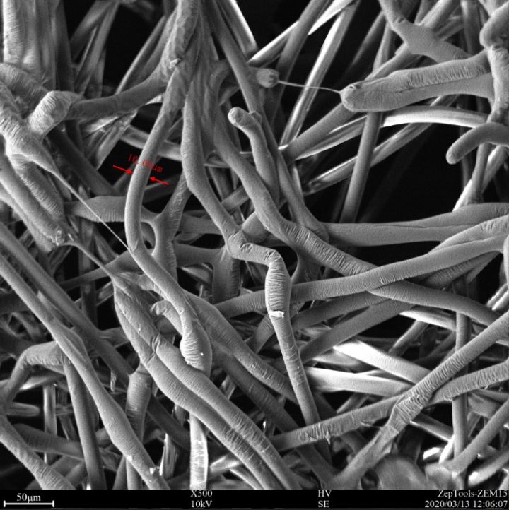 圖2 醫(yī)用外科口罩1中間過濾層(熔噴布層)的掃描電鏡照片。可以看到該層密集排布著1 - 15 um的纖維結(jié)構(gòu)。